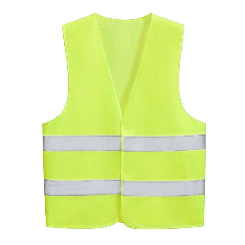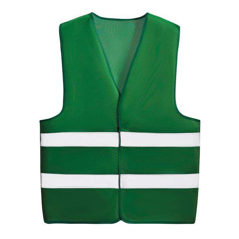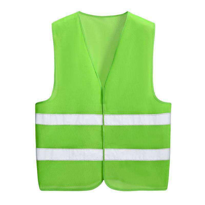 Chaleco de seguridad reflectante verde con dos rayas blancas para uso laboral, material de fibra de poliéster