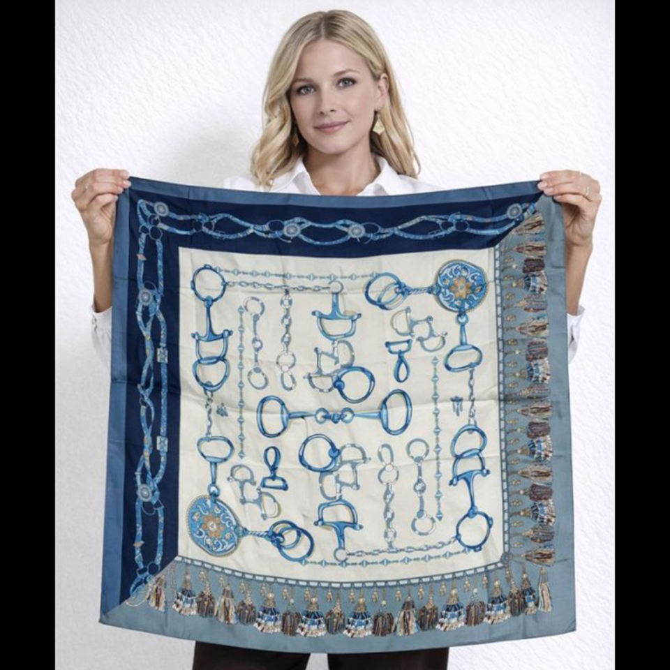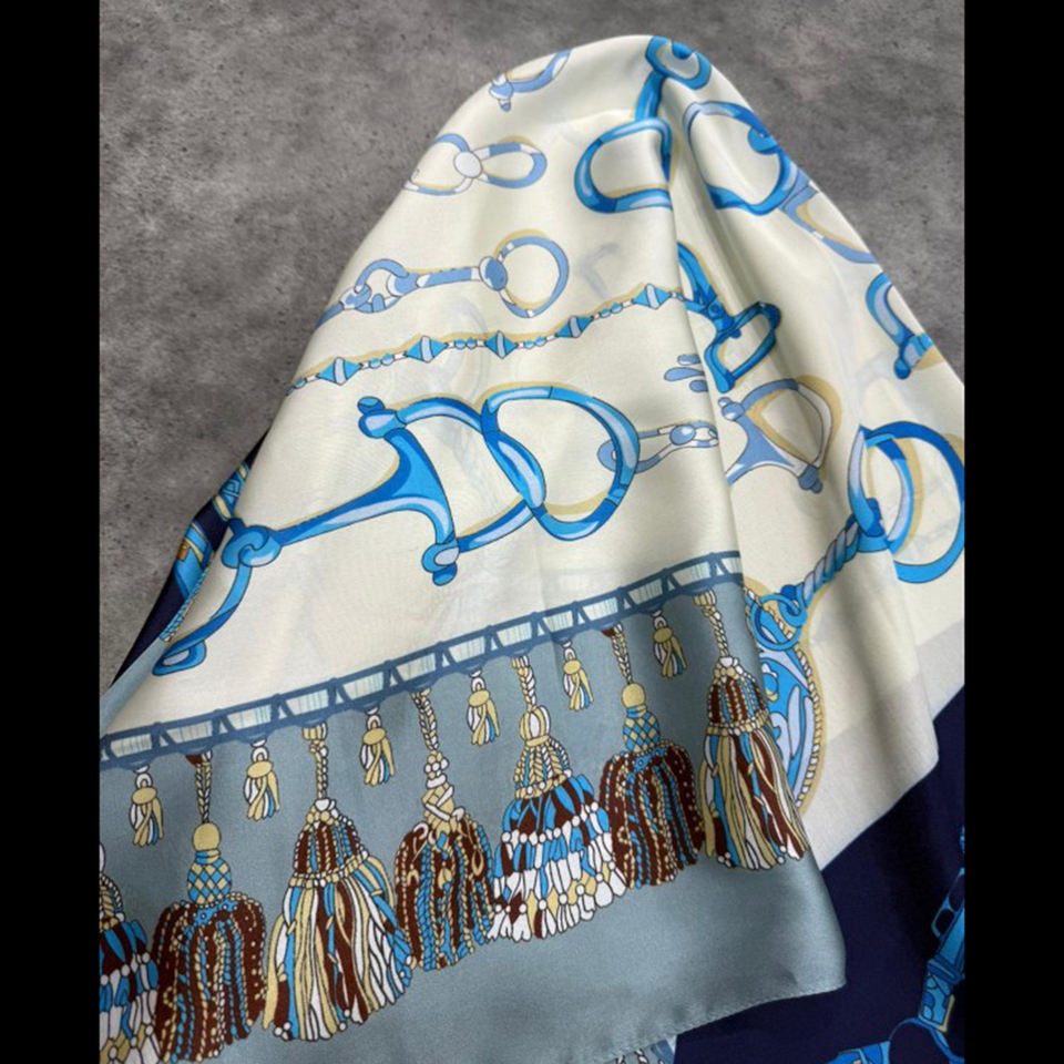 Pañuelo cuadrado de poliéster satinado con diseño de llavero y cadena ecuestres, tacto sedoso, con dobladillo a máquina, estilo bandana.