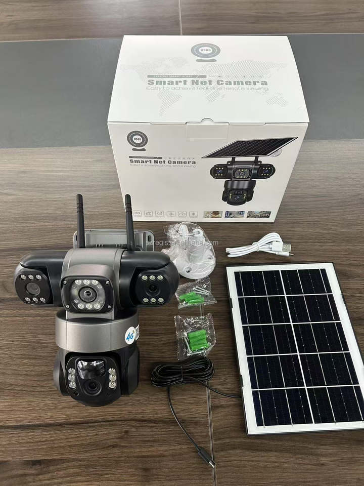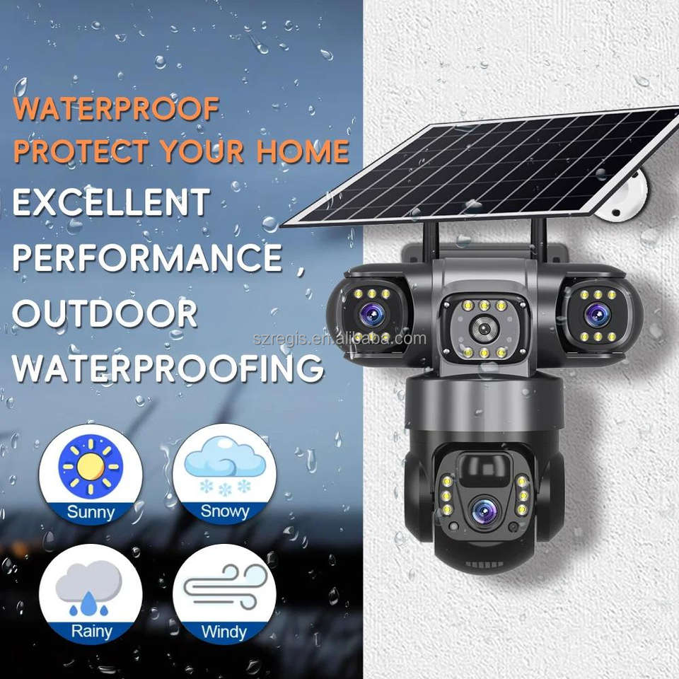 Cámara IP Regis de 3 Lentes 4G HD 12MP 6K para Exteriores CCTV a Prueba de Agua con Visión Nocturna, PTZ de Dos Vías, Seguimiento Móvil y Nube Solar V380 PRO