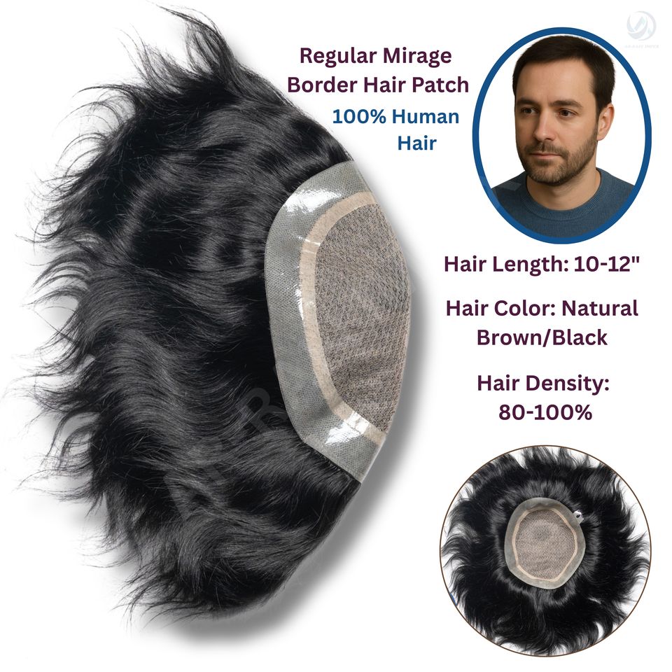Parche de pelo regular Mirage Border o tupé para hombres, cabello Remy indio, textura recta, estilo de onda corporal