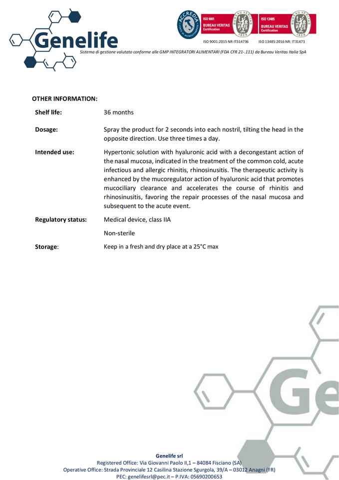 Spray Nasal de Solución Hipertónica de Ácido Hialurónico de Marca Italiana, Confiable para el Tratamiento de la Rinitis Infecciosa