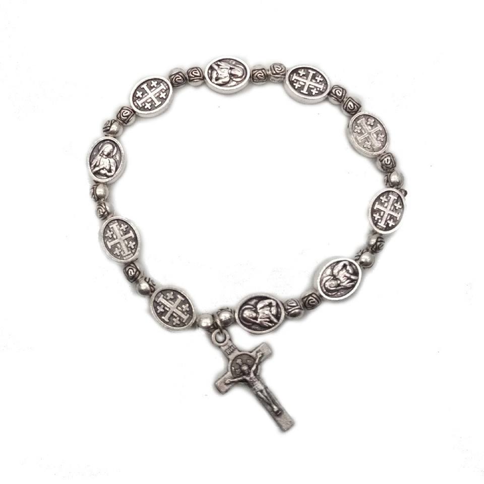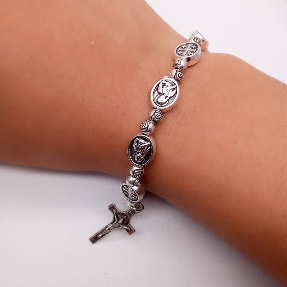 Pulseras de Metal de aleación de plata para hombres, brazalete religioso de San Benito clásico, con cuentas de San Benito, con Rosario