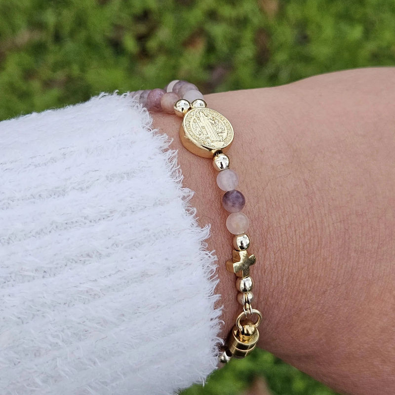 Pulsera de Rosario Completa con Medalla de San Benito y Cierre Magnético de Piedra Violeta Religiosa, para Regalo de Primera Comunión
