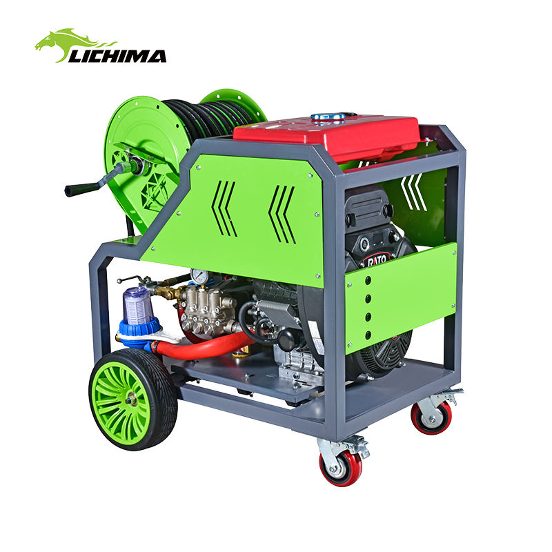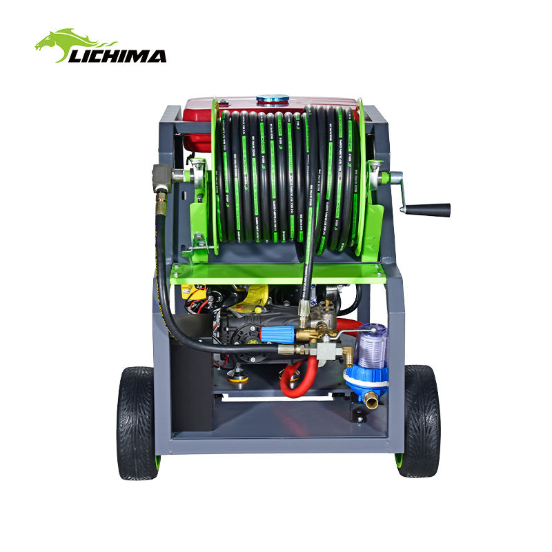 Máquina de limpieza a chorro de gasolina con control remoto, limpiador de desagües y manguera de alta presión