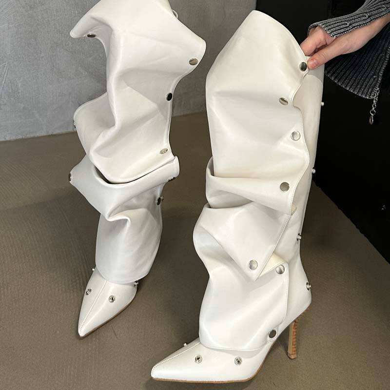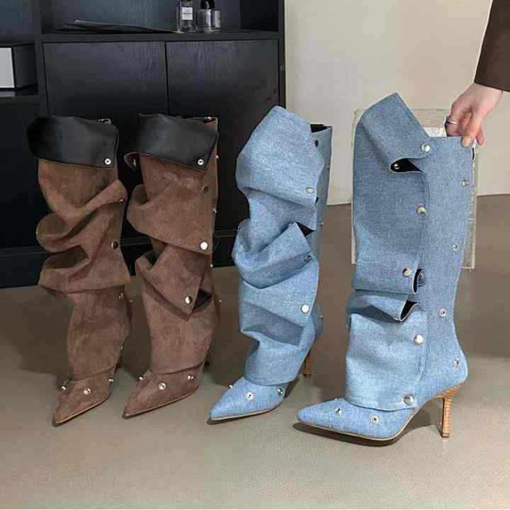 Botas de mezclilla para mujer con botones extraíbles decorativos, tacón fino y altura hasta la rodilla.
