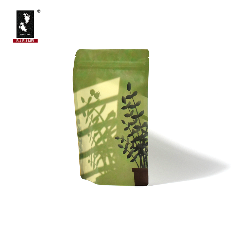 Bolsa de plástico resellable con ventana de hoja verde y cremallera inferior cuadrada para almacenamiento de alimentos