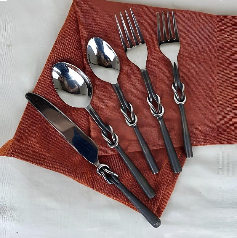 Juego de Cubiertos de Metal Forjado a Mano Resistentes con Mangos Anudados, Acabado Plateado para Uso en Hogares, Hoteles y Restaurantes