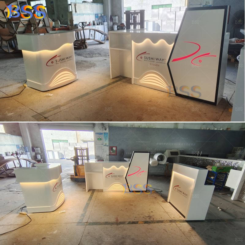 Mostrador de restaurante Mármol artificial blanco Bistro comercial Cóctel Jugo Sushi Comida Marina Pescado Restaurante Bar Mostrador Muebles