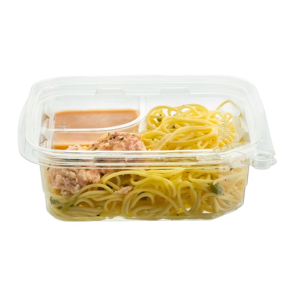 Contenedor cuadrado de 2 compartimentos para alimentos, material PET de grado restaurante, 21 OZ, caja de plástico reciclable para almacenamiento de fideos