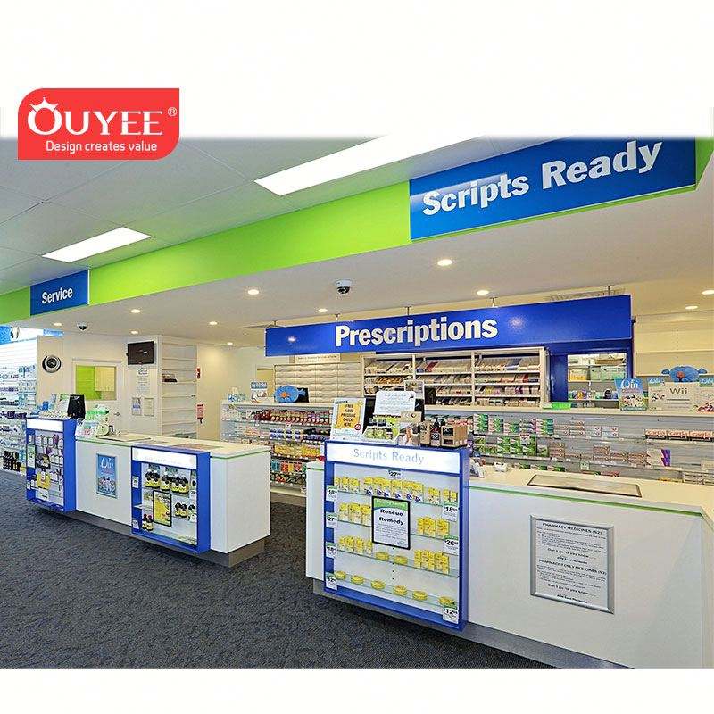 Tienda de farmacia minorista Diseño de interiores Tienda médica Muebles de exhibición Diseño moderno de mostrador de tienda para tienda de farmacia
