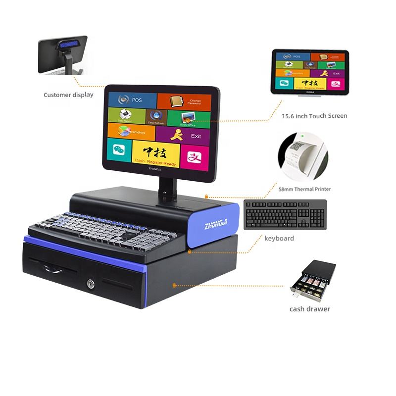Solución para Minoristas, Sistema POS Windows de 15.6 Pulgadas, Terminal de Punto de Venta con Caja Registradora para Tiendas y Mercados