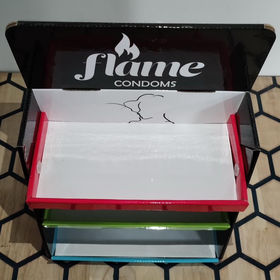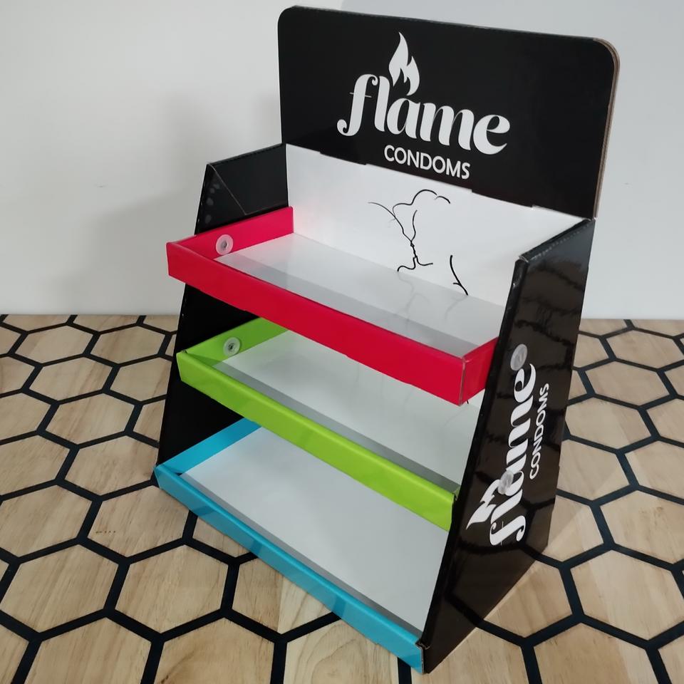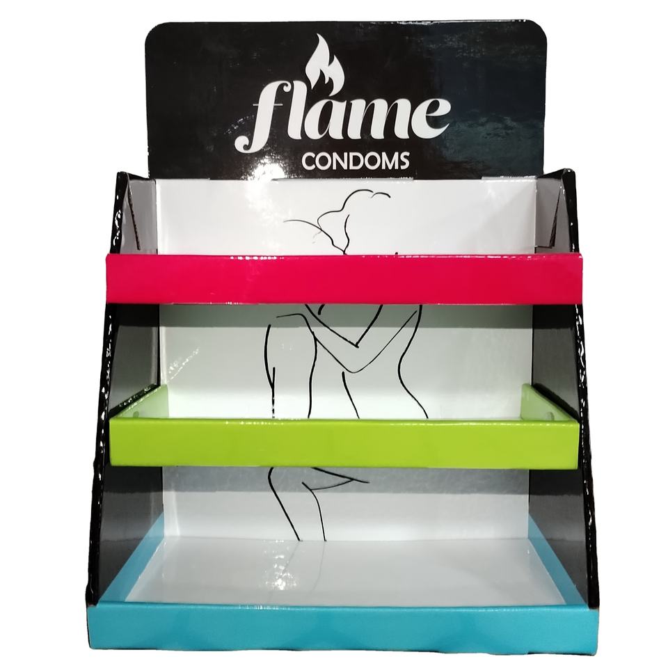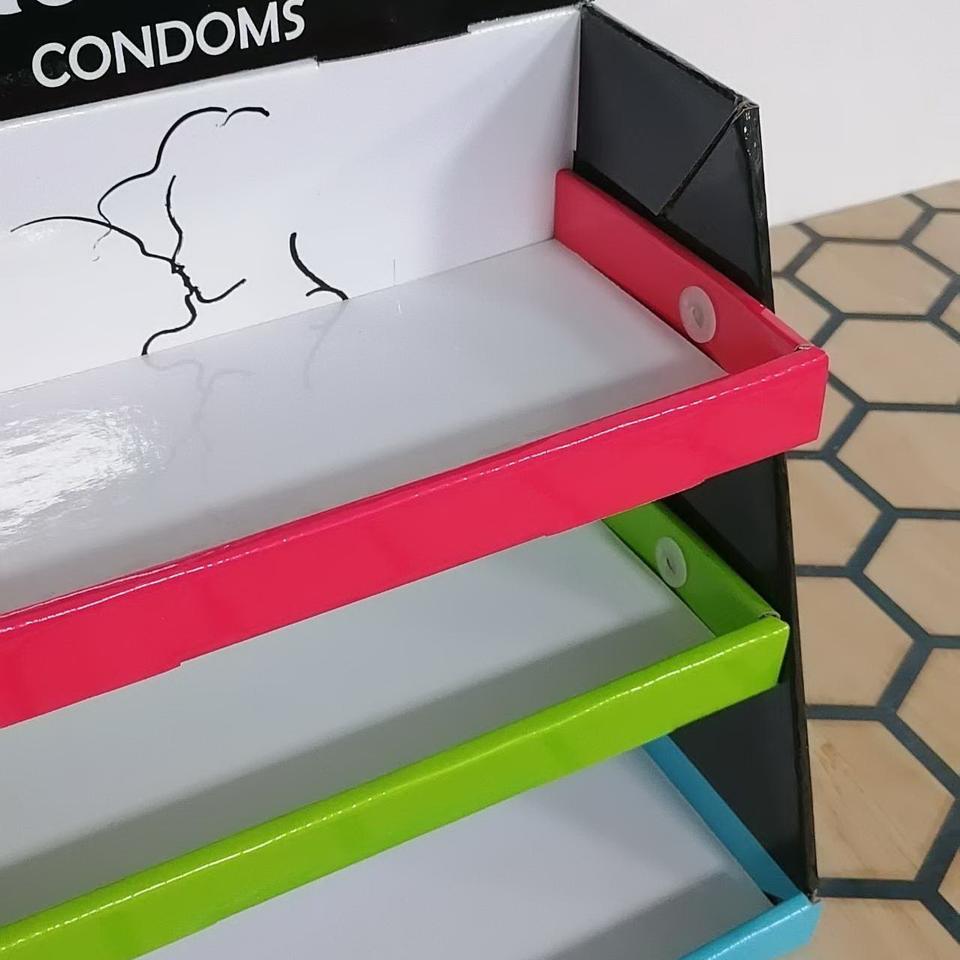 Tienda minorista tienda encimera 3 niveles cartón PDQ condón productos sexuales caja de exhibición soporte