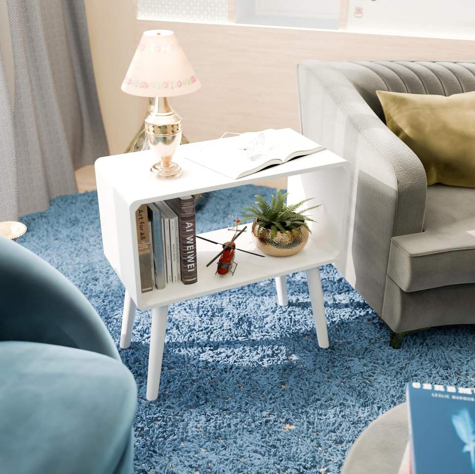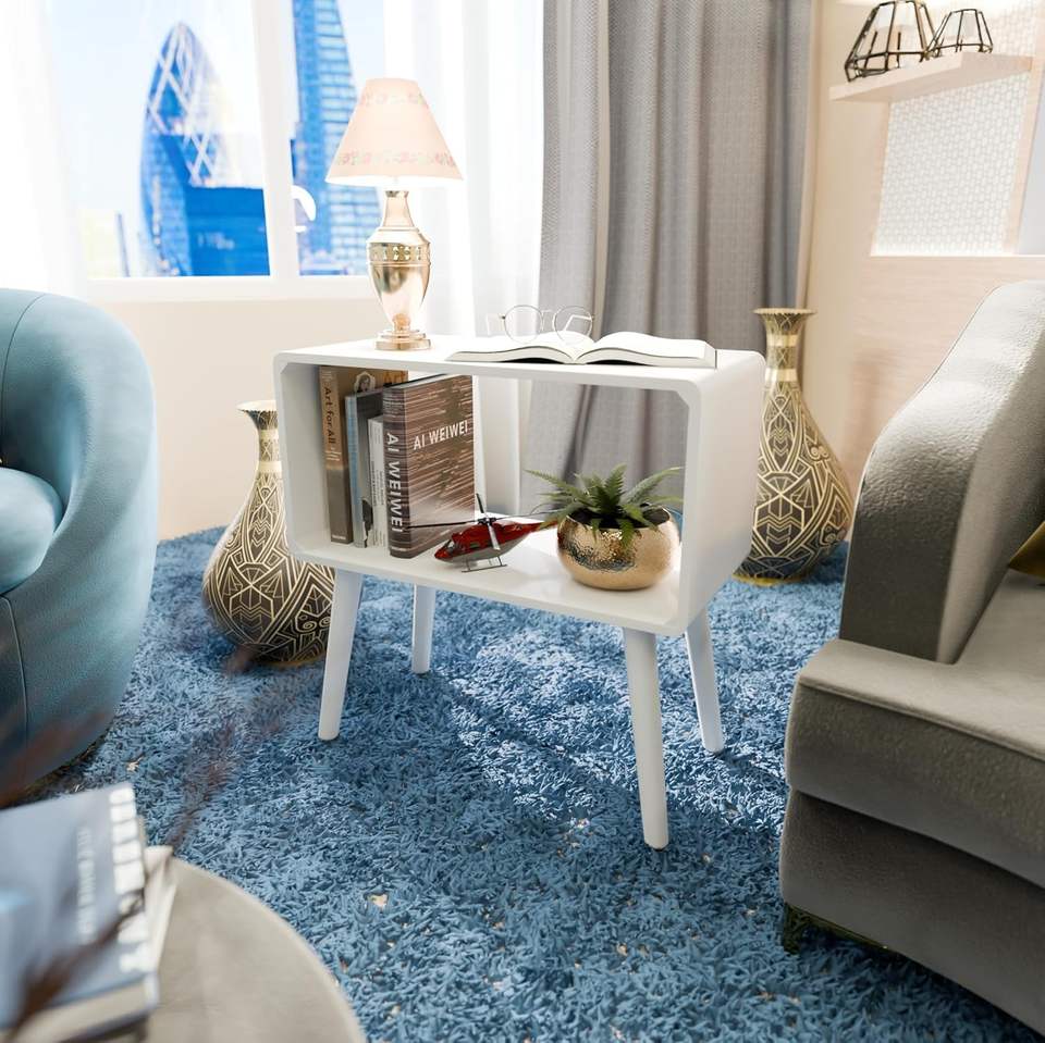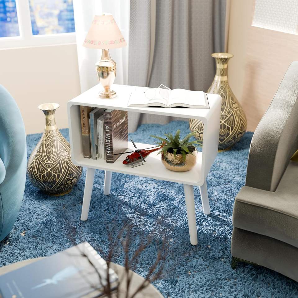Mesa de Noche Retro, Mesa Auxiliar, Mesa de Cabecera para Espacios Pequeños, Revistero con Almacenamiento, Madera Sintética