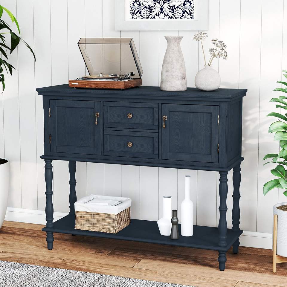 Mesa Consola Retro con 2 Cajones y 2 Gabinetes con Puertas, Mesa Larga para Entrada, Mesa Consola Estrecha con Almacenamiento