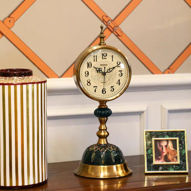 Retro Desktop Table Clock Circular Silent European Style Home Decoration Living Room Ornament Gold Base Antique Design