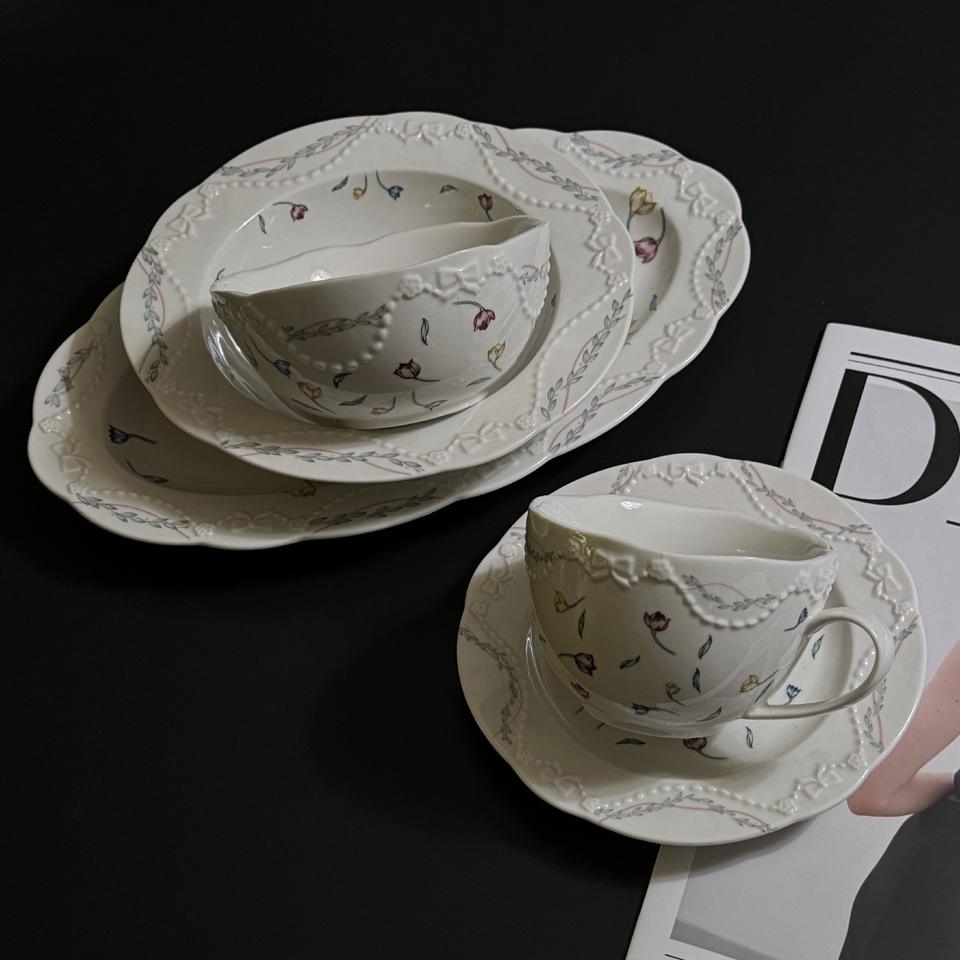 Juego de vajilla de cerámica con flores en relieve retro, platos de cena franceses, cuencos, tazas y platillos, juegos de platos