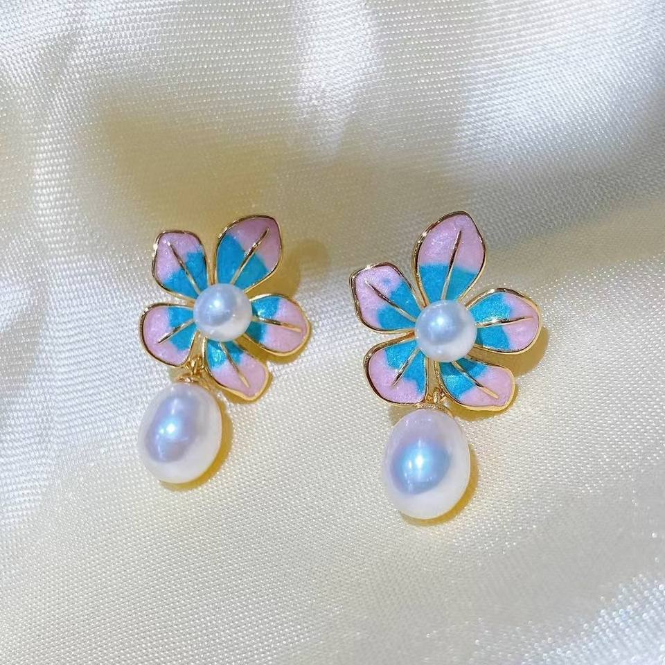 Pendientes de Pintura al Óleo con Flores en Degradado Estilo Francés Retro, Accesorios de Perlas con Encanto Femenino, Diseño Fresco y Dulce