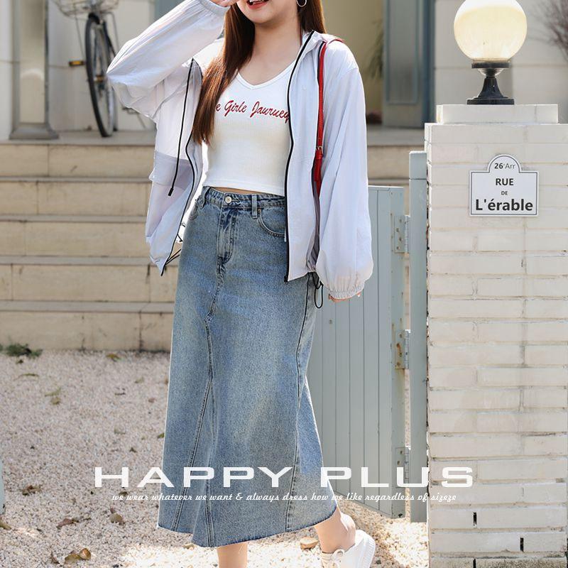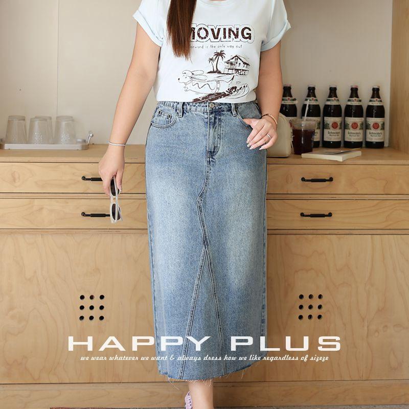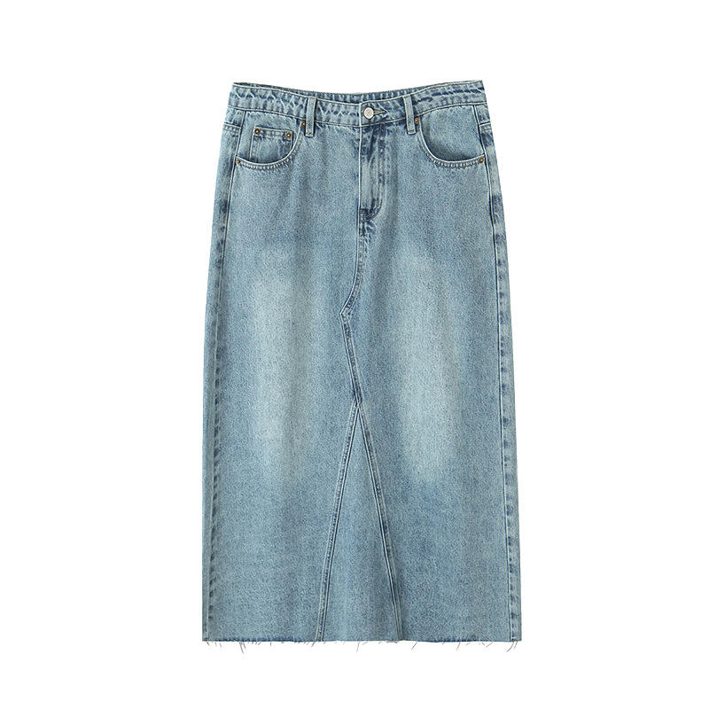 Falda midi vaquera retro de cintura alta con abertura, azul lavado, talla grande 90 95, informal de verano para mujer