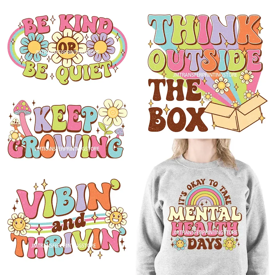 Retro Keep Growing Chasing Está bien tomar el día de la salud mental Citas de pensamiento inspiradoras Pegatinas de transferencia DTF para ropa