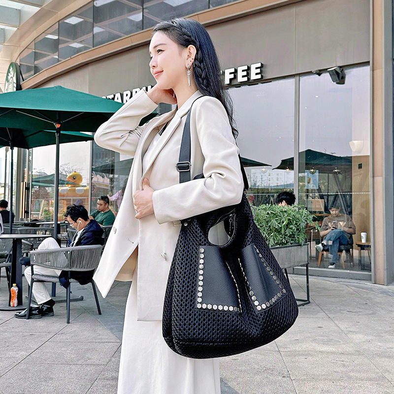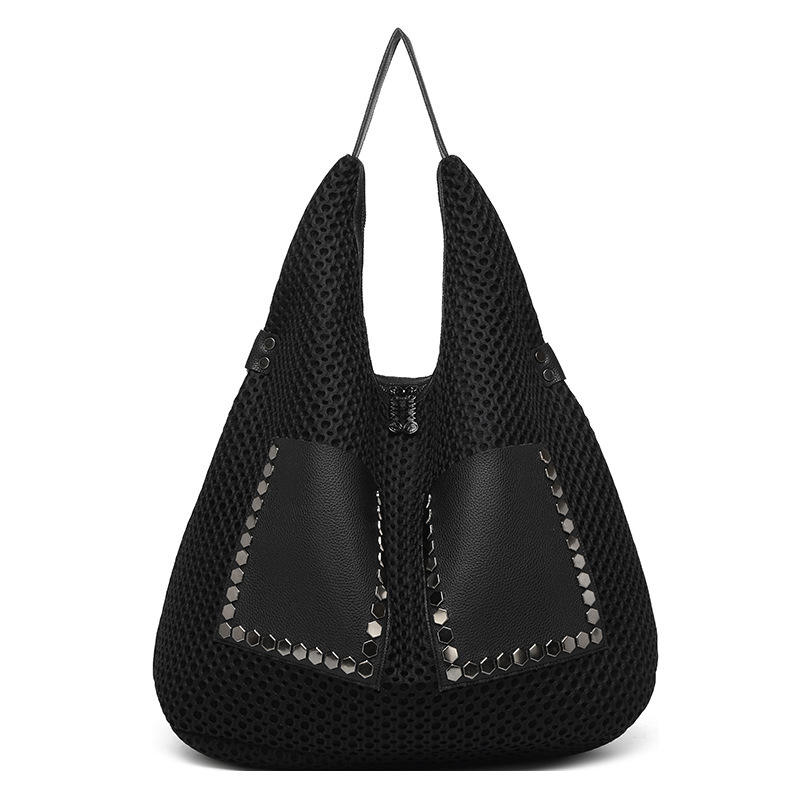 Bolso de mano de malla retro, de gran capacidad bolso de hombro, estilo punk, remache, cierre de cremallera para mujer