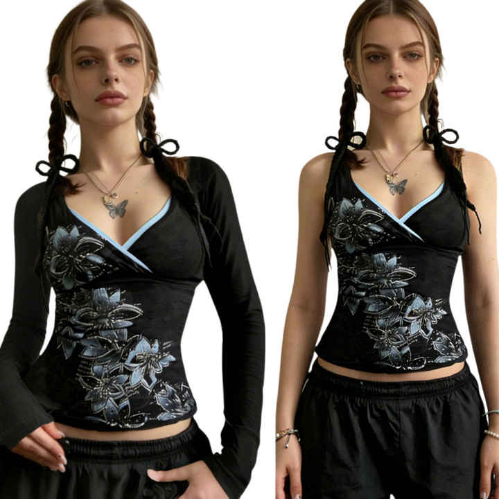Jersey pulóver vintage con estampado digital de plantas, cuello en V, corte ajustado, manga larga, anti-UV, secado rápido, tejido de otoño con ribetes en contraste