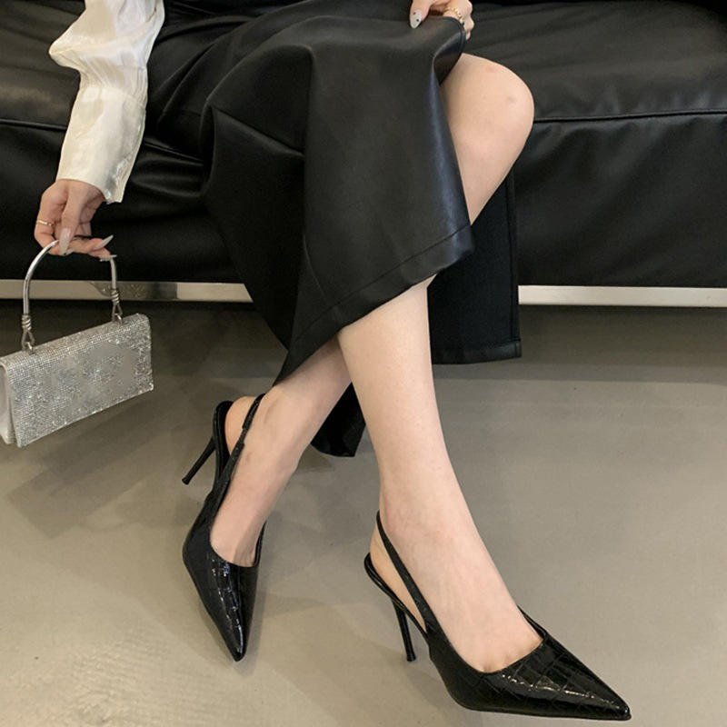 Tacones Altos Negros con Punta en Pico Retro, Zapatos de Tacón de Aguja Versátiles para Mujer, Primavera, Peep-toe, Sin Espalda, Sexys, Franceses, con Punta Cerrada