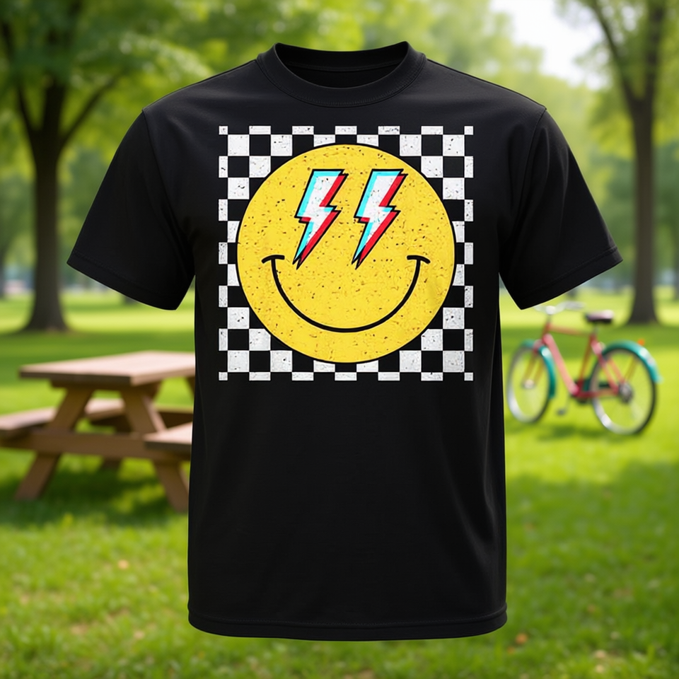 Camiseta Retro con Estampado a Cuadros y Cara Sonriente, Diseño Moderno y Alegre