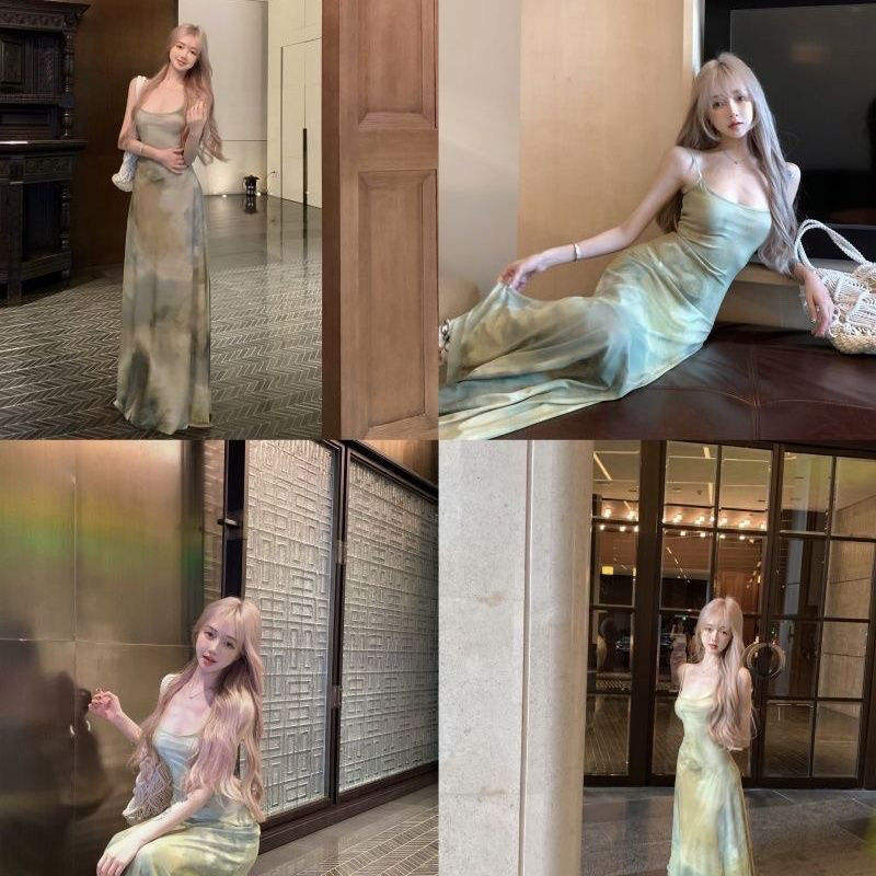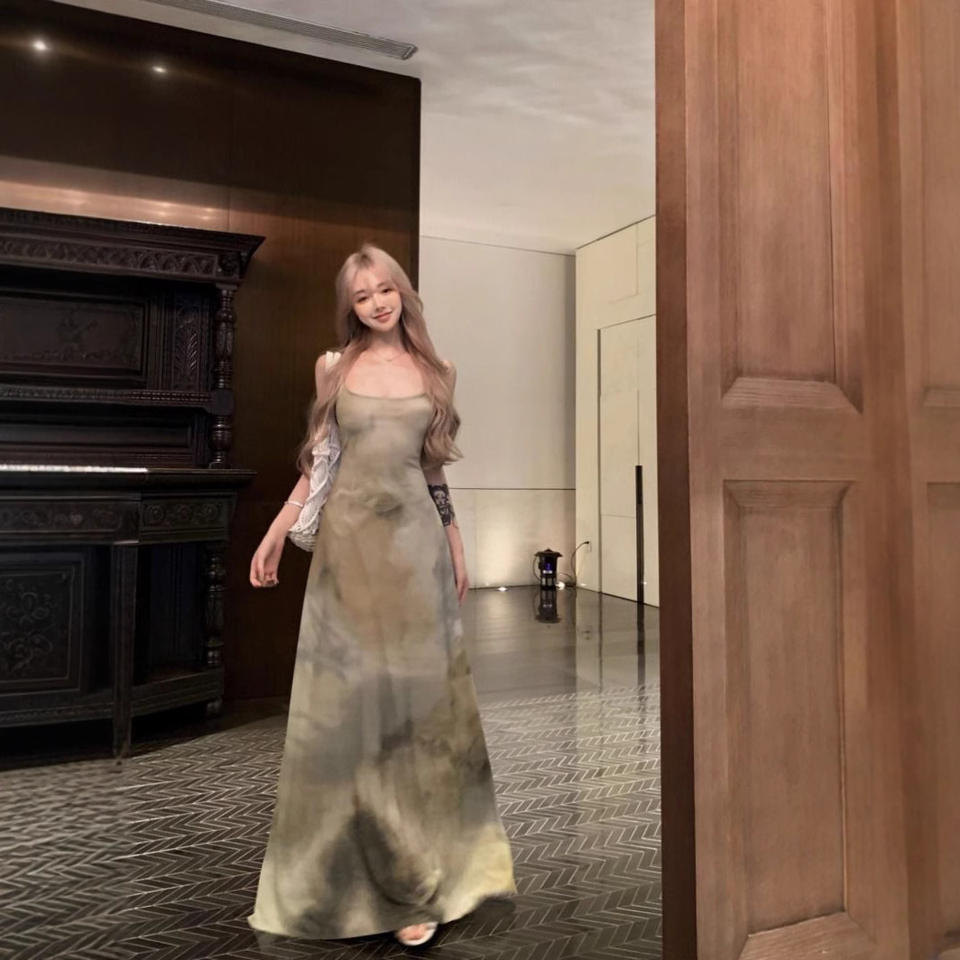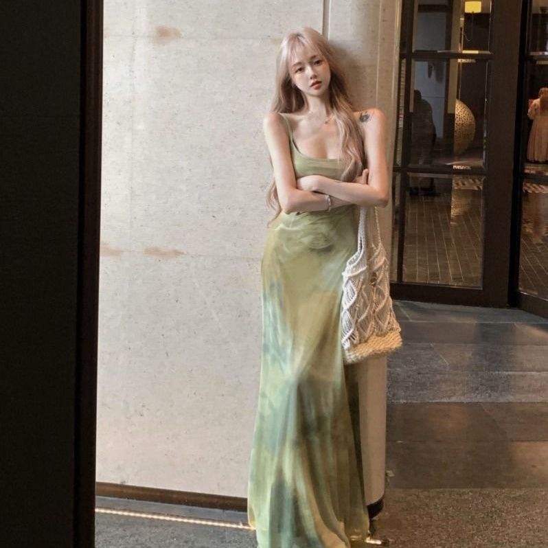 Vestido Maxi de Estilo Retro con Estampado Verde Claro, Tirantes Finos, Cintura Natural, Casual, Veraniego, Vintage