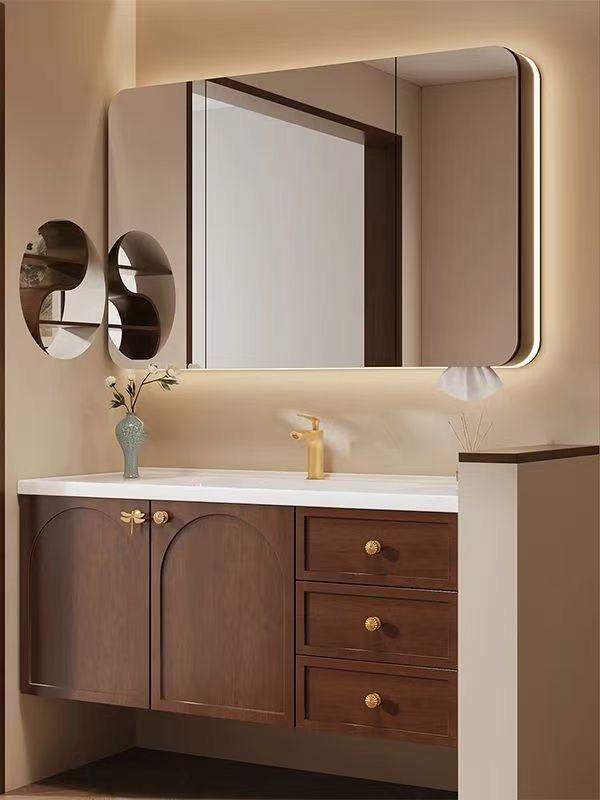 Mueble de baño multifuncional retro de madera maciza con espejo LED y almacenamiento