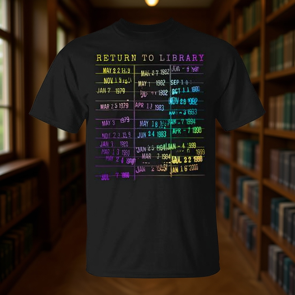 Camiseta con estampado de arcoíris y la frase: Regresa a la biblioteca, tarjeta de biblioteca, fecha de devolución del libro