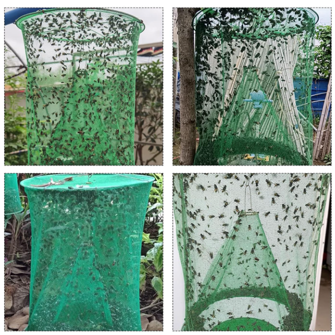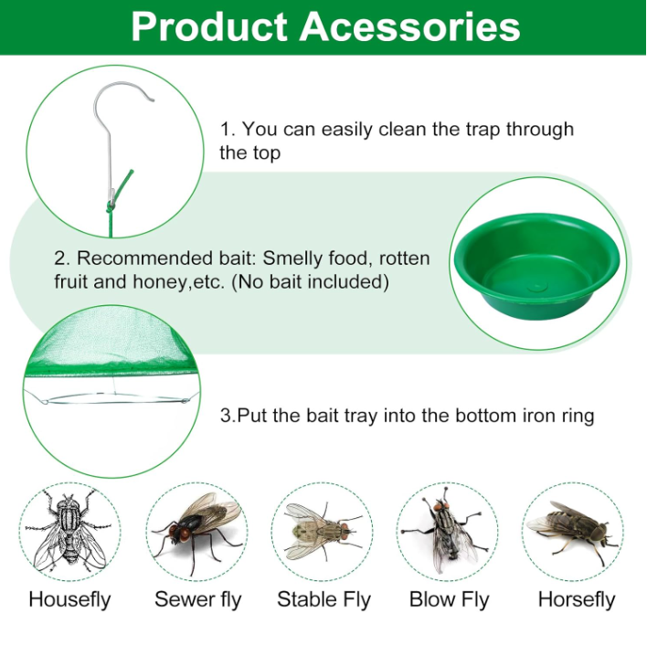Trampas reutilizables para moscas, atrapamoscas colgante para exteriores, jaula de cazador asesino con bandeja de cebo