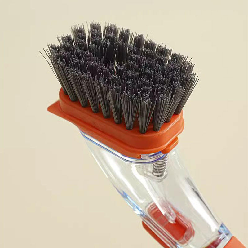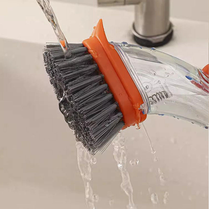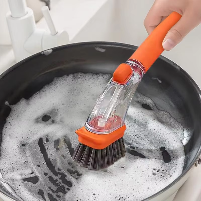 Cepillo de limpieza reutilizable para cocina con mango largo, dispensador de líquido, herramienta de limpieza de ollas de PP, artefacto con esponja recargable para