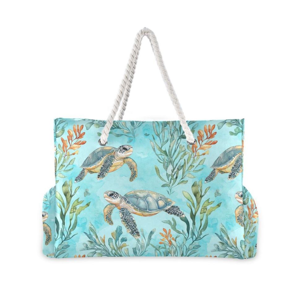 Bolso de playa reutilizable para mujer con asa de cuerda, diseños de tortuga, de tela de nailon, portátil, con cierre de cremallera, ideal para el verano.