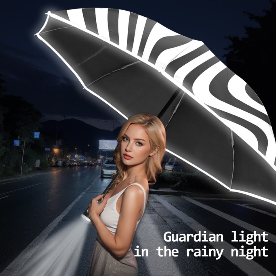 Paraguas Invertido de 3 Pliegues, Resistente al Viento, Totalmente Automático, con Luz LED, Varillas de Aleación, Tiras Reflectantes, Seguridad Nocturna, 190T Pongee, Automático