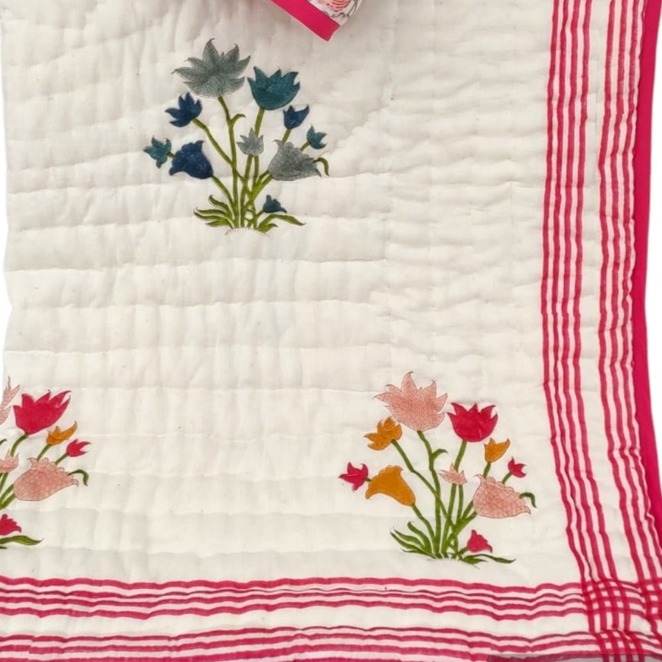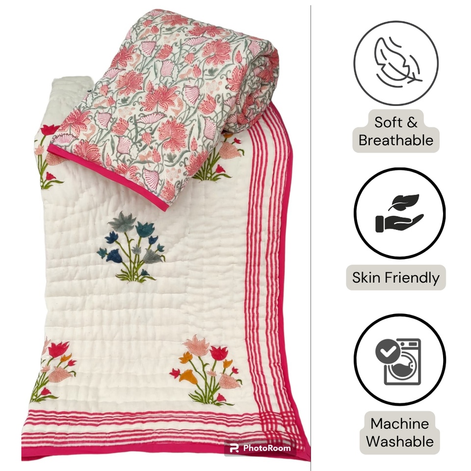 Edredón de algodón con estampado de bloques de mano reversible | Motivo floral multicolor con borde de rayas rosas | Estampado de edredón moderno y peculiar