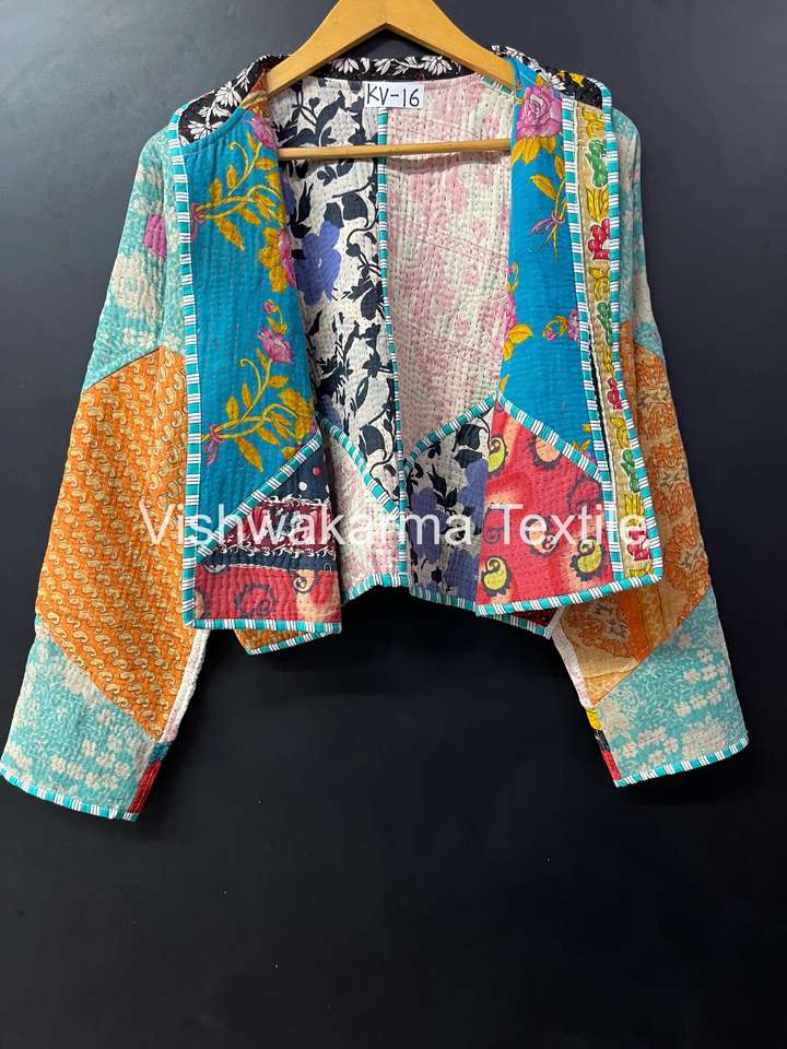 Chaqueta Corta Reversible de Algodón con Parches Kantha, Hecha a Mano en India, Ecológica, para Otoño e Invierno, Estilo Vintage