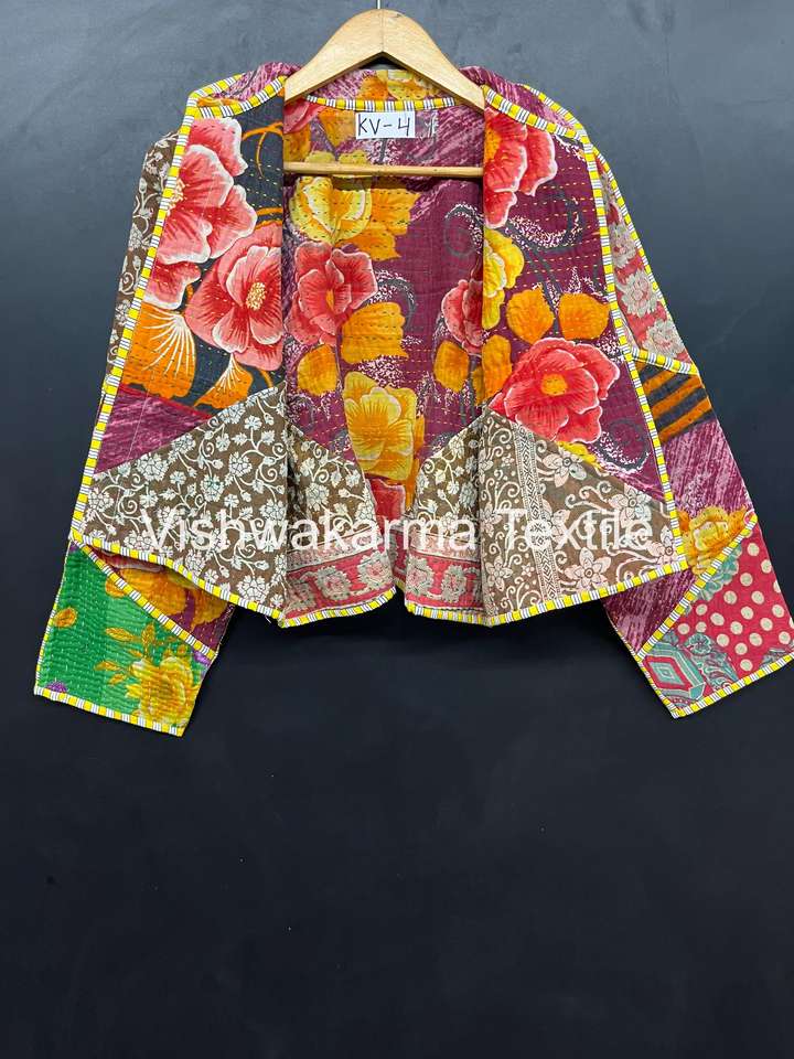 Chaqueta Corta Kantha Reversible Vintage, Chaqueta de Cuello Alto Kantha Hecha a Mano Ecológica para Mujer, Chaqueta de Invierno de Algodón Puro con Botones