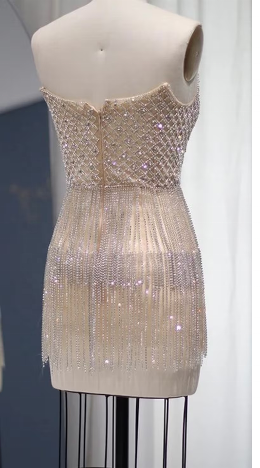 Vestido de Fiesta Elegante y Sexy con Pedrería y Lentejuelas, sin Tirantes, Recto, Mini, con Cintura Natural