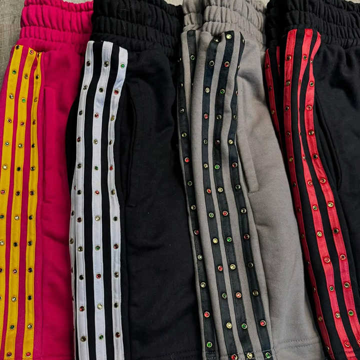 Pantalones cortos con rayas laterales de diamantes de imitación con cordón francés Terry algodón serigrafiado pantalones cortos de sudor personalizados para hombres