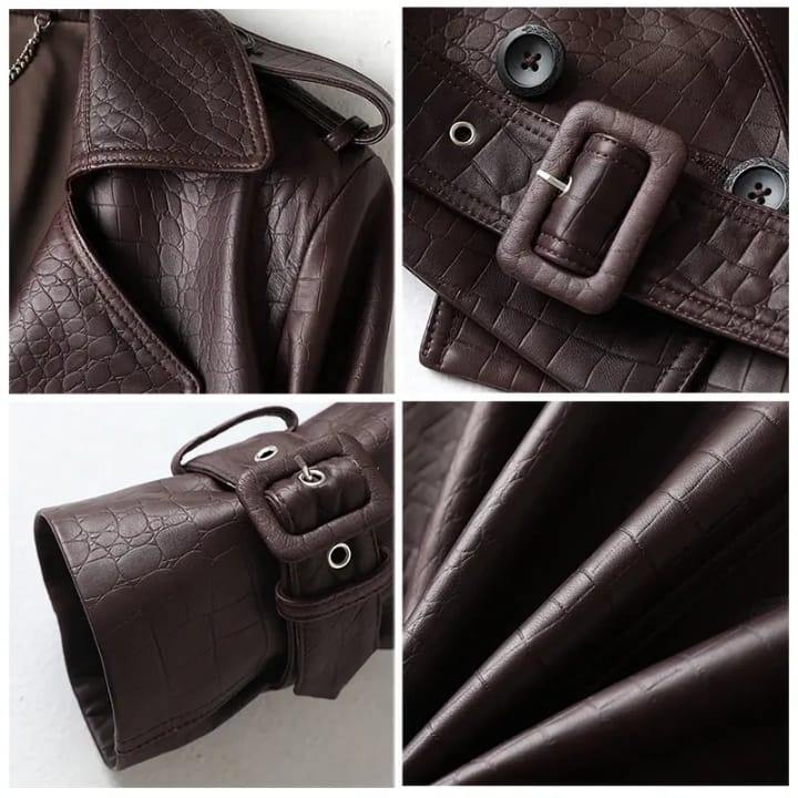 Chaqueta de cuero de moda para mujer, color marrón oscuro, de piel de cordero, de lujo, con cinturón, estilo motero, corte corto, solapa ancha, tipo moto.