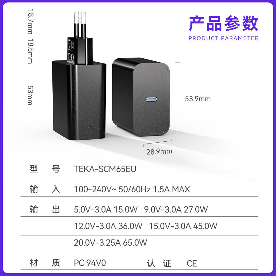 Adaptador de Carga Rápida GaN de 65W Tipo C para Teléfono, Tableta y Portátil, Estándar Europeo, Certificado CE