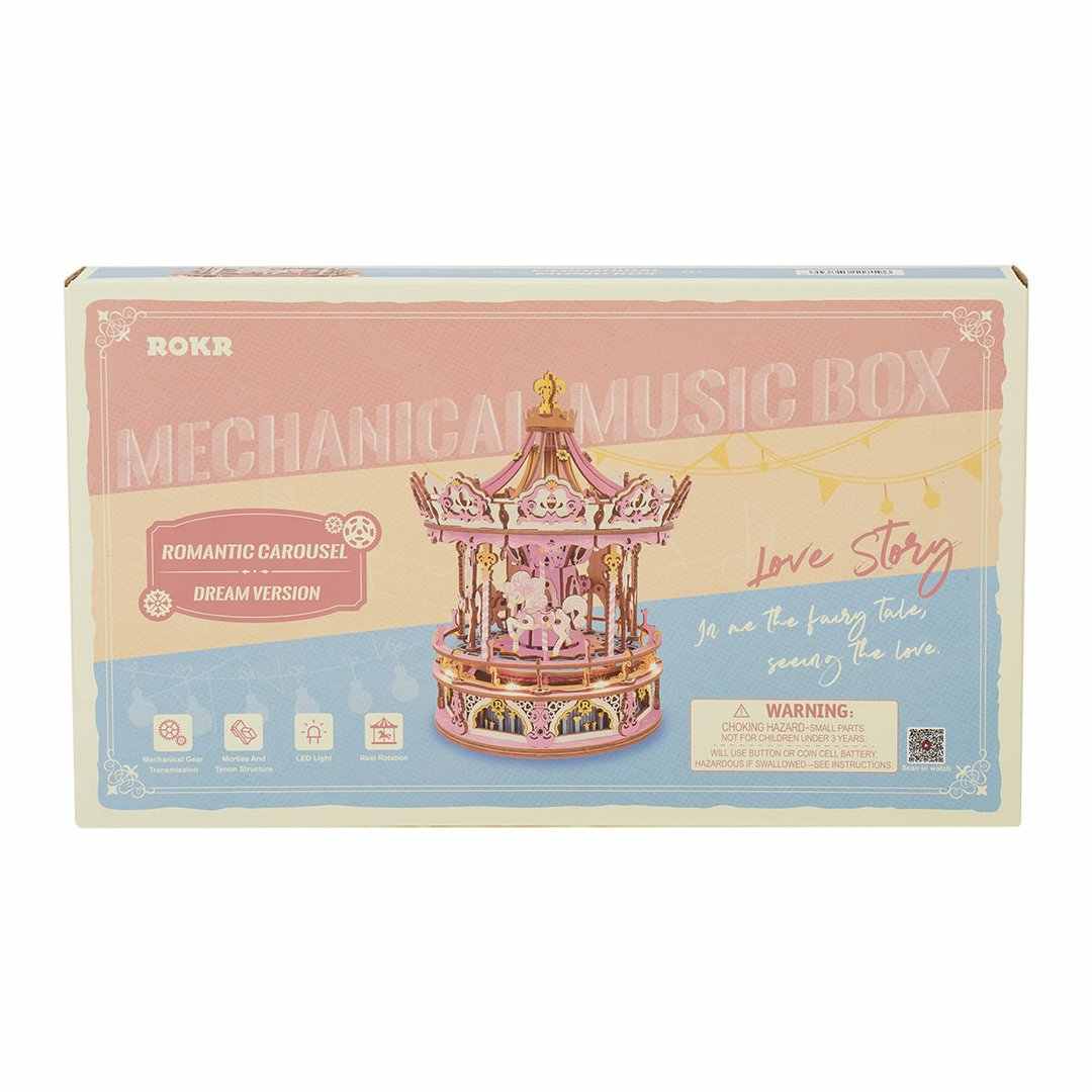 Robotime Rokr AMK62J hecho a mano ensamblado Rosa romántico carrusel caja de música DIY 3D rompecabezas de madera