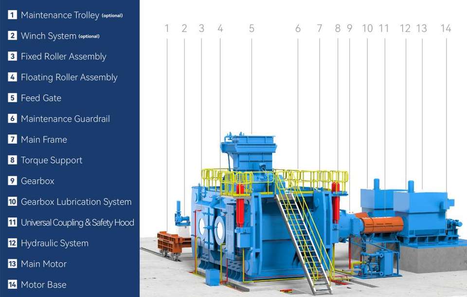 Rollos, Marco, Sistema de Transmisión (Motor), Acoplamientos, Sistema Hidráulico, Rodamientos y Sistema de Lubricación, Tolva de alimentaciónLos componentes principales.