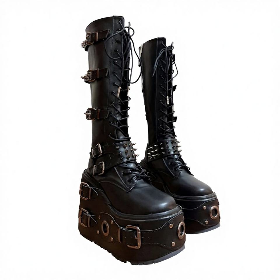 Botas de motociclista punk con plataforma, remaches de roca, cuña en la puntera, suela gruesa, atadas cruzado, con hebilla de cinturón de estilo robusto, de cuero vacuno estilo caballero