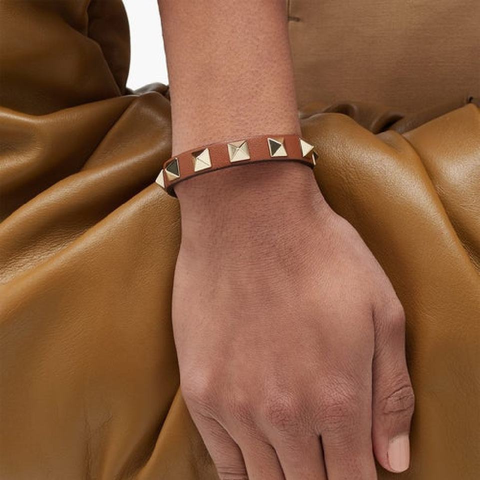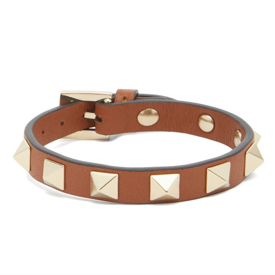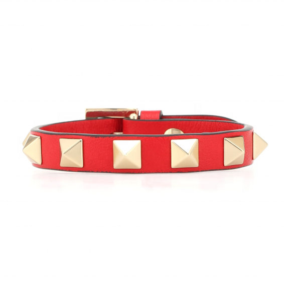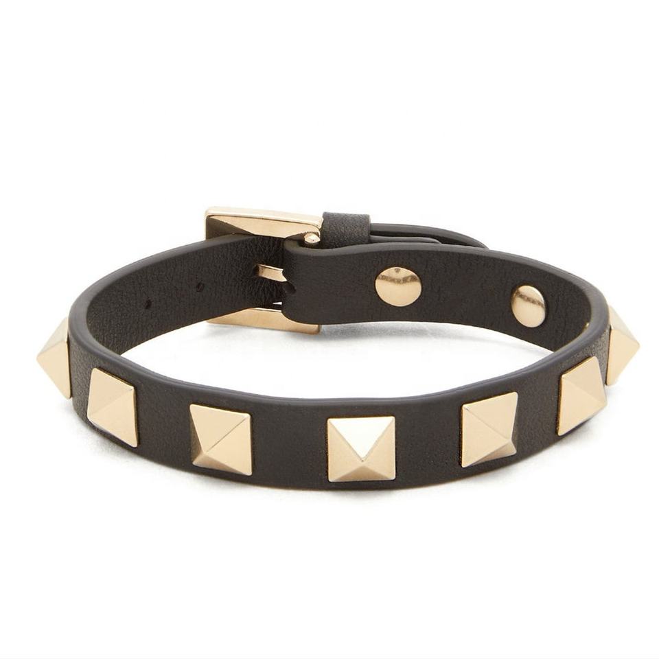 Rockstud metallic iconic pyramidal golden studs adjustable buckle fastening belt leather bracelet to be packed with regular opp bag.
