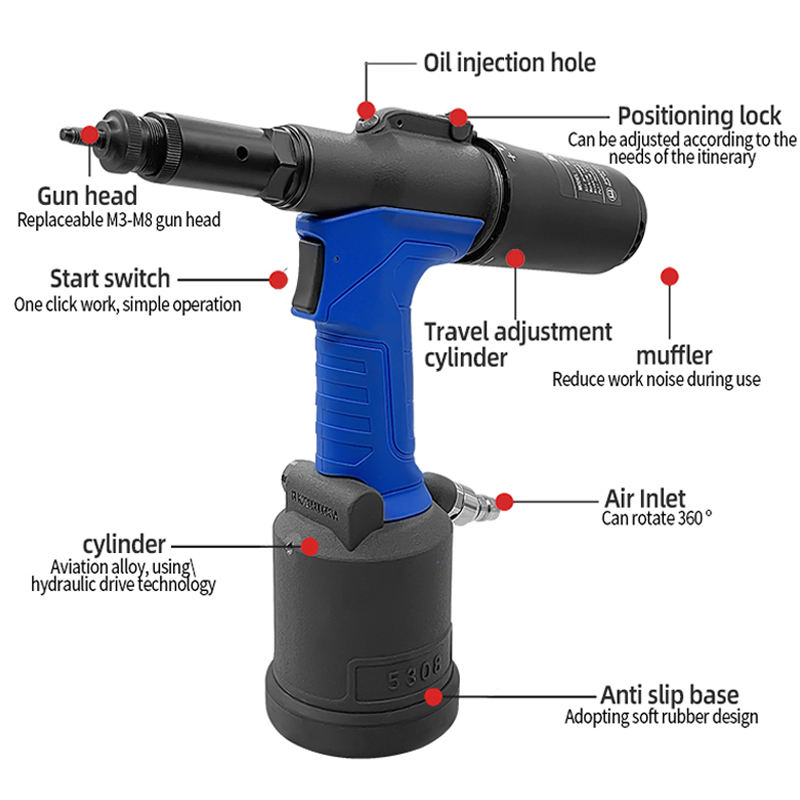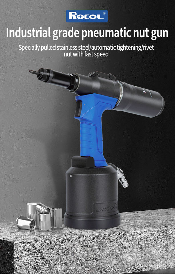 Remachadora Neumática Rocol RL-5308, Consumo de Aire de 5-7 BAR, Velocidad sin Carga de 4500 RPM, Diseñada para Remachado de Tuercas M3-M8 de Alta Resistencia