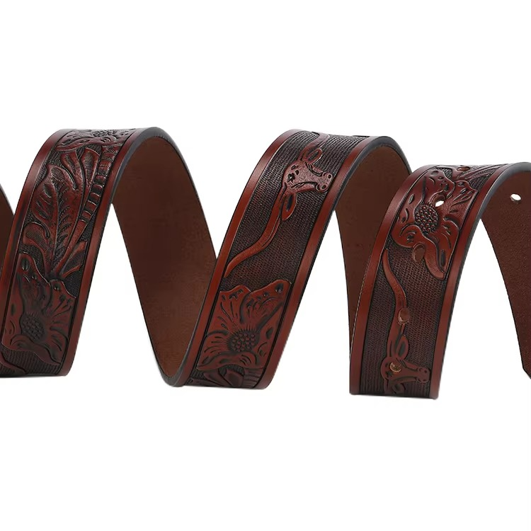 Cinturón Rodeo de Cuero Vacuno Genuino de Tres Capas, Estilo Vintage Occidental con Cuentas y Diseño Floral Grabado a Mano, Hebilla de Cobre para Hombre y Mujer