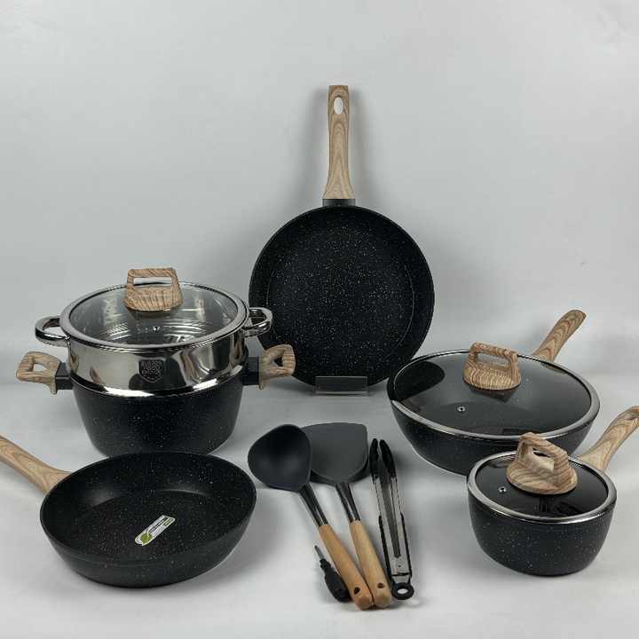 Rofee Ventas Directas 13 piezas Juego de utensilios de cocina de aluminio forjado Granito negro Revestimiento de mármol Cazuelas juego de cocina con cesta de vapor