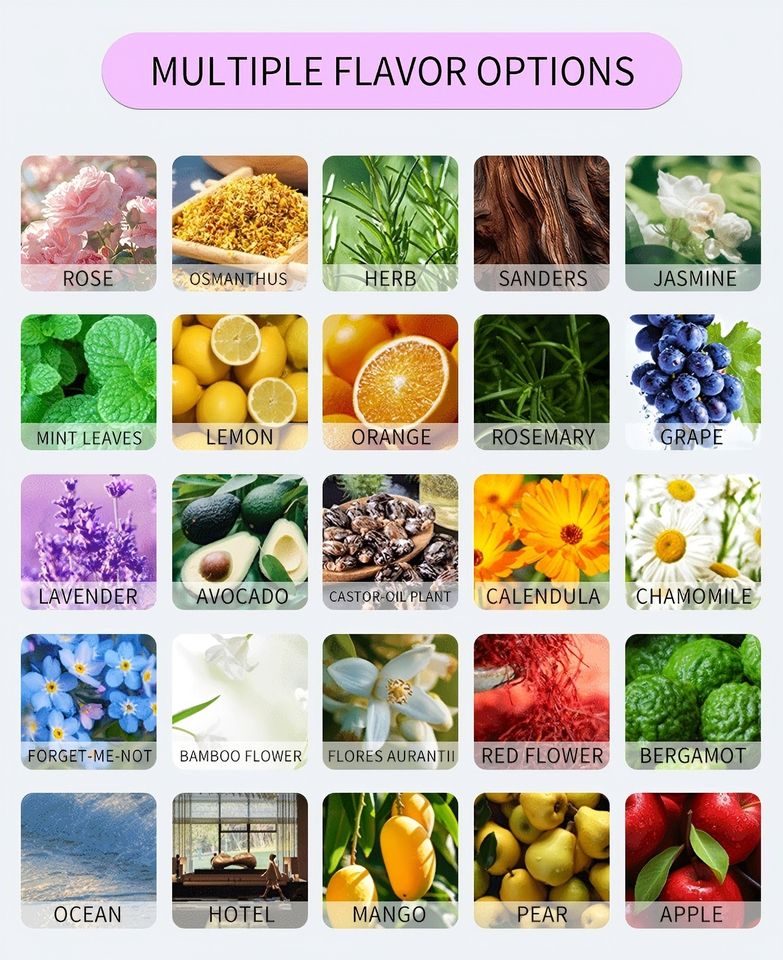 Aceite de Jojoba, Romero, Árbol de té, Eucalipto, Lavanda, Cedro, Mandarina, Manzanilla, Incienso, Sándalo, PatchouliIngrediente