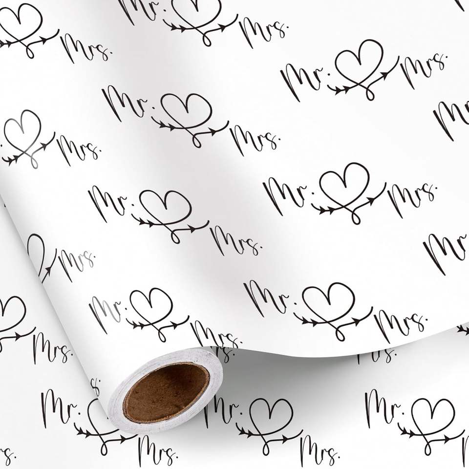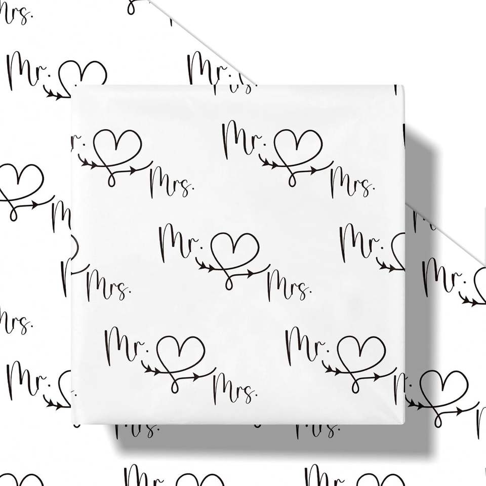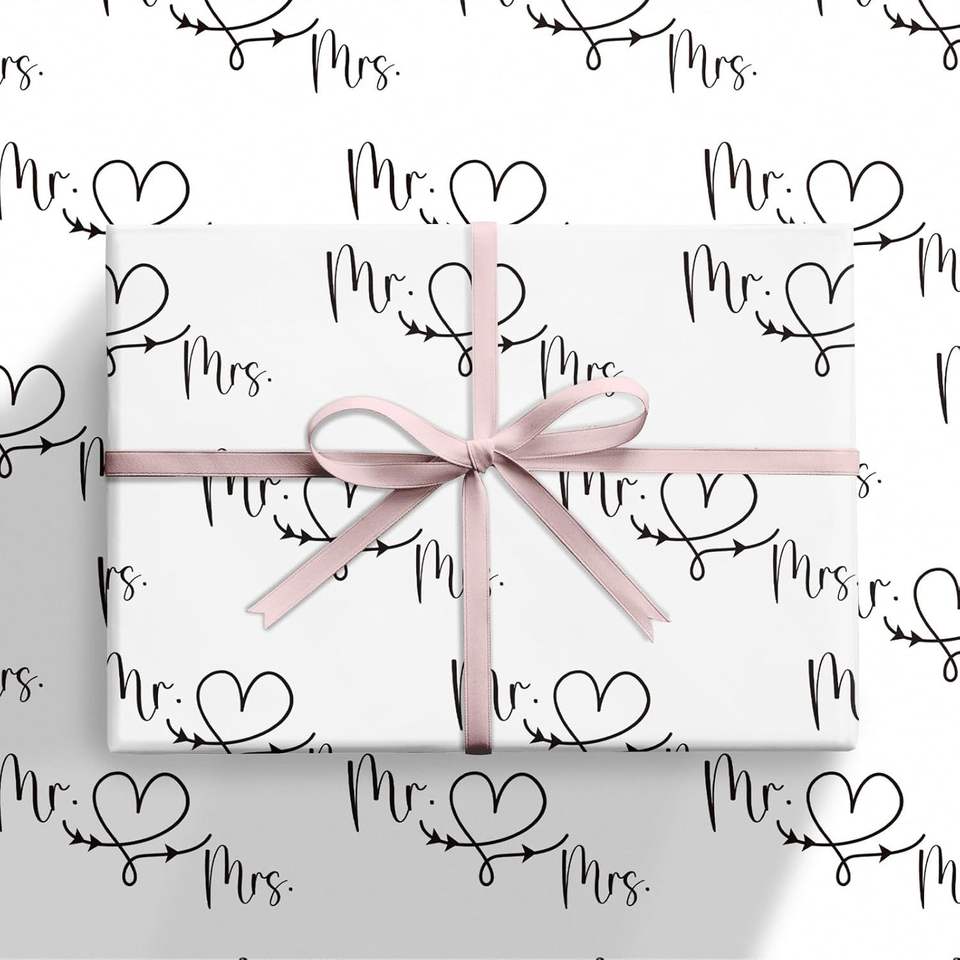 Papel de Regalo Romántico para Boda, Rollo Mini, Diseño en Blanco y Negro de Mr. y Mrs. con Patrón de Flecha de Corazón para Envolver Regalos